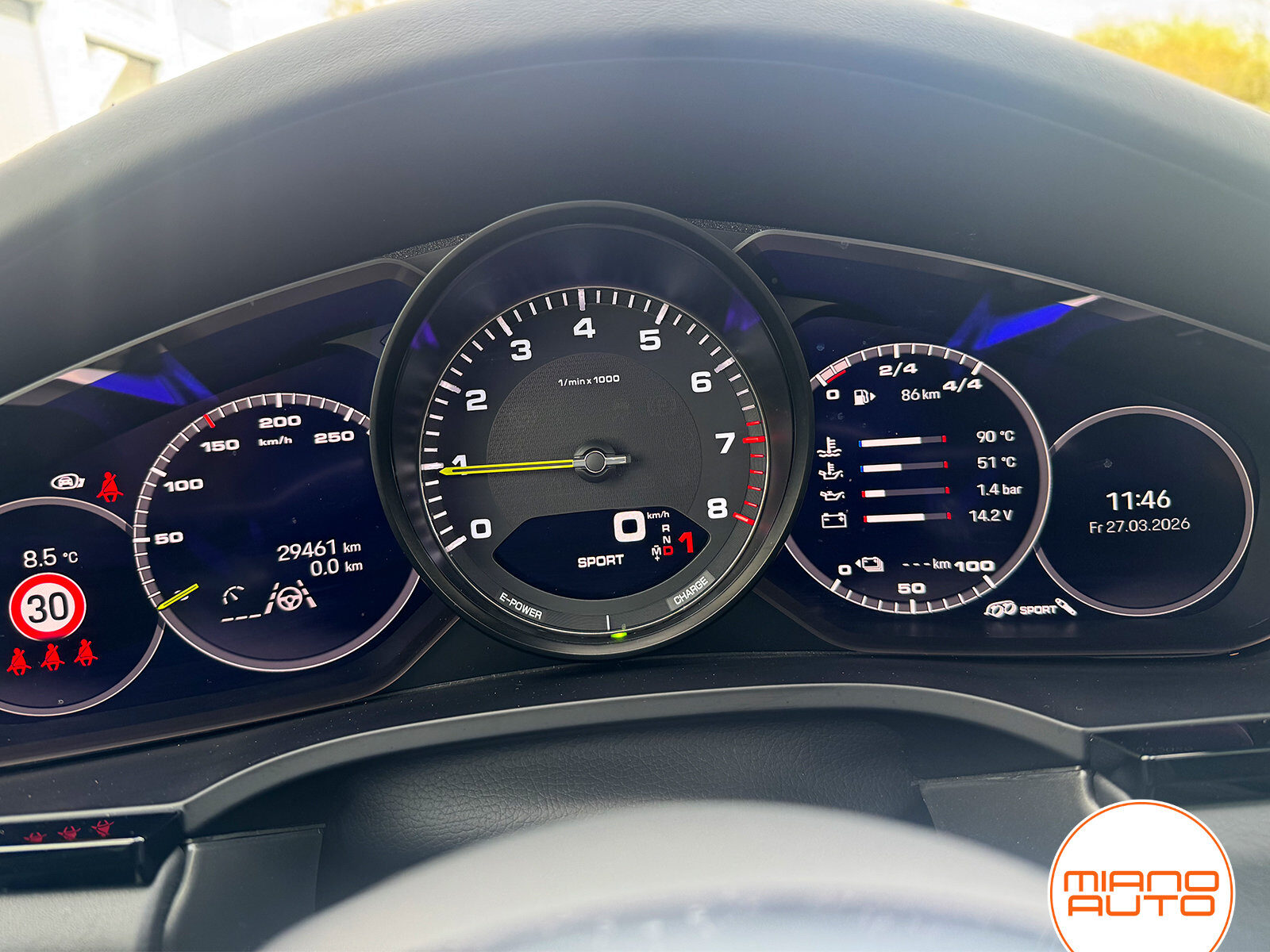 Zentraler analoger Drehzahlmesser mit schwarzem Ziffernblatt, gelben Drehzahlmesser und Modellschriftzug